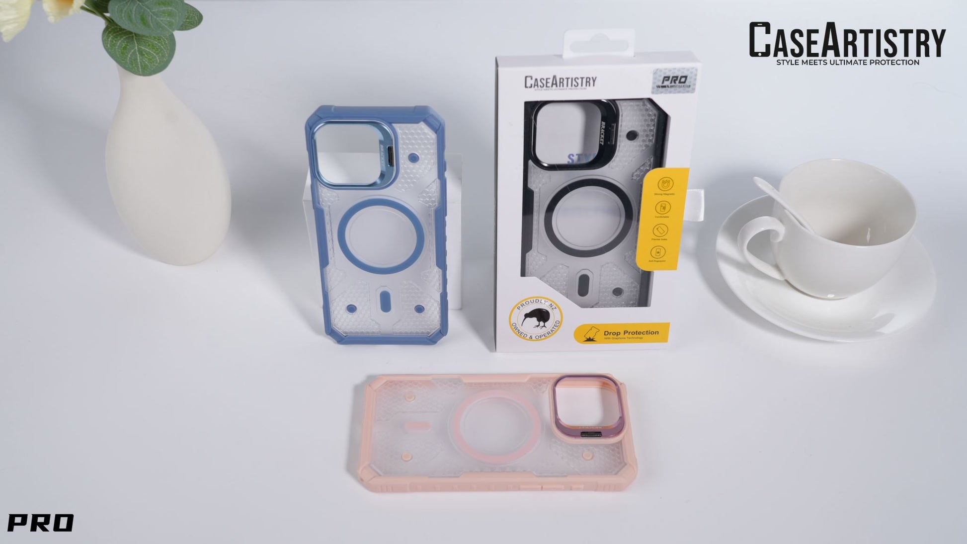 Available in elegant hues like Midnight Black, Blush Pink, and Ocean Blue, the Mag Shield Pro wraps your phone in a robust, shock-absorbing frame without compromising on style.